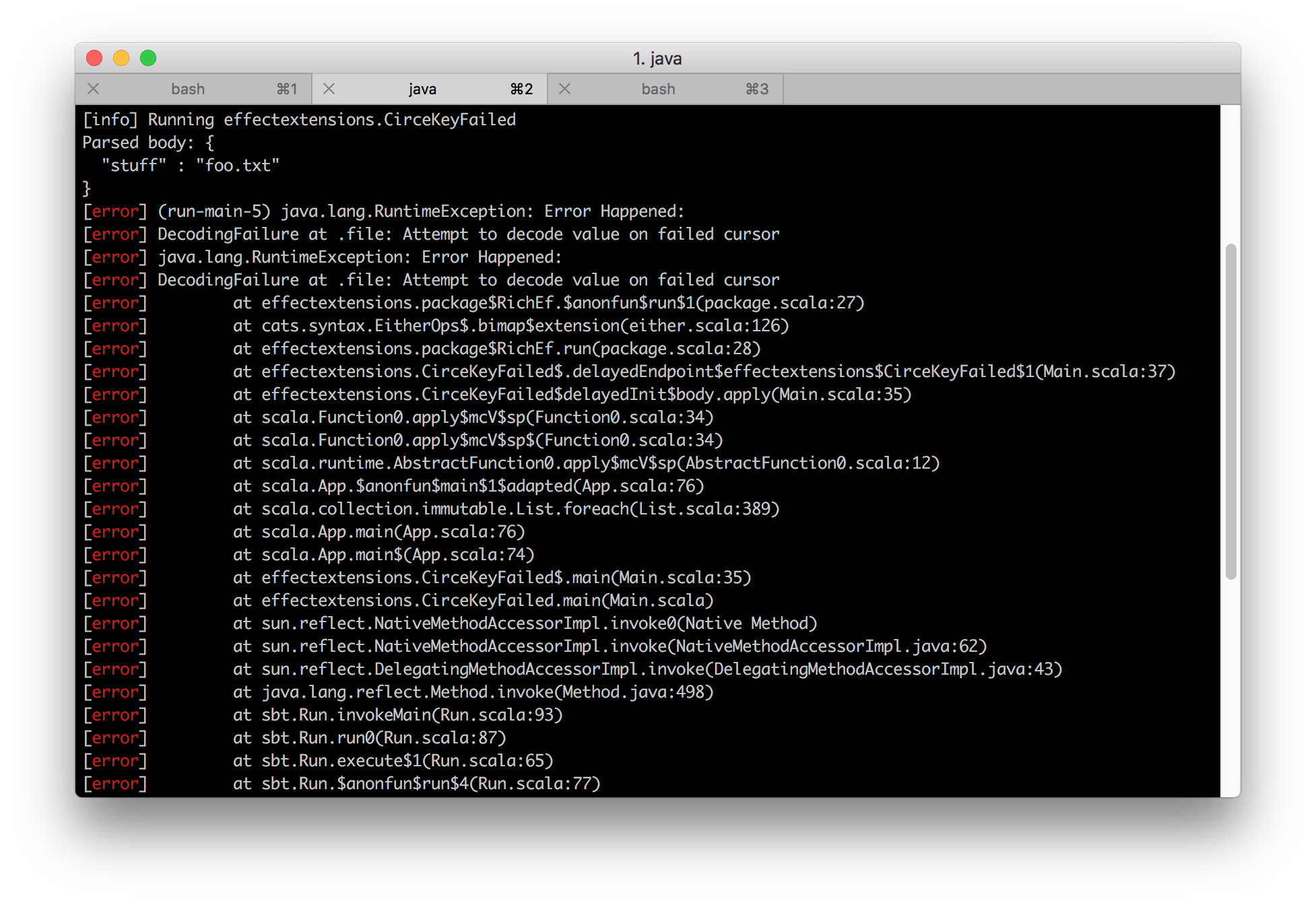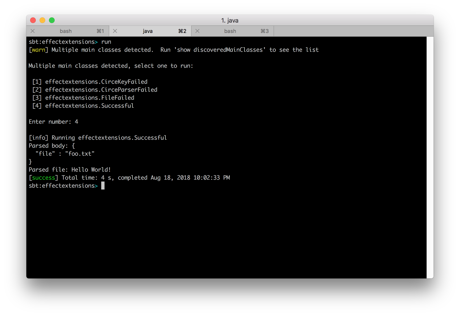 is a result type. We encounter this effect type when parsing and accessing JSON, points (1), (3) in the handler algorithm above. - Side Effect: Suspension. We need to lift operations like the output to the command line into the IO context. We encounter this side effect when printing to the command line, points (2), (5) above.